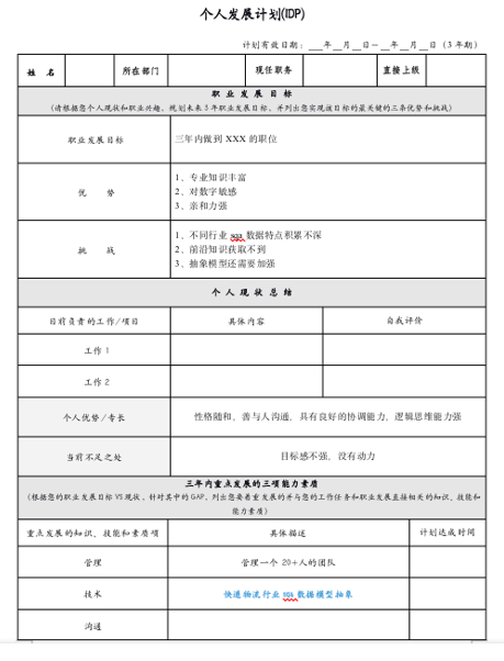 下面是我们目前做的IDP模版,供大家参考。上面会有个人信息、职业发展目标,优势、挑战、现状总结、三年内重点发展的能力、具体行动计划等内容。